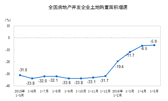 1-5月份,房地產(chǎn)開發(fā)企業(yè)土地購置面積7196萬平方米,同比下降5.9%,降幅比1-4月份收窄0.6個百分點(diǎn);土地成交價款2295億元,增長4.7%,1-4月份為下降0.2%。