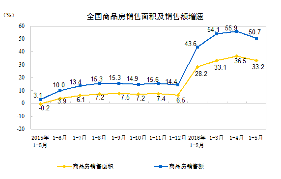 1-5月份,商品房銷售面積47954萬平方米,同比增長33.2%,增速比1-4月份回落3.3個百分點(diǎn)。其中,住宅銷售面積增長34.2%,辦公樓銷售面積增長44.0%,商業(yè)營業(yè)用房銷售面積增長18.1%。商品房銷售額36775億元,增長50.7%,增速回落5.2個百分點(diǎn)。其中,住宅銷售額增長53.4%,辦公樓銷售額增長72.8%,商業(yè)營業(yè)用房銷售額增長21.2%。