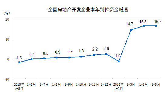 1-5月份,房地產(chǎn)開發(fā)企業(yè)到位資金53681億元,同比增長16.8%,增速與1-4月份持平。其中,國內(nèi)貸款8945億元,增長2.3%;利用外資42億元,下降72.1%;自籌資金18643億元,增長1.4%;其他資金26051億元,增長39.4%。在其他資金中,定金及預(yù)收款14840億元,增長35.2%;個人按揭貸款8838億元,增長58.5%。