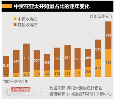 摩根大通報(bào)告顯示,亞太地區(qū)2015年的并購(gòu)總量為1.5萬(wàn)億美元,其中中國(guó)企業(yè)發(fā)起的并購(gòu)交易量為7350億美元,較2013年增長(zhǎng)近兩倍;兩年時(shí)間里,中國(guó)在整個(gè)亞太地區(qū)并購(gòu)交易量中的占比從35%增長(zhǎng)到50%。