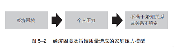 在現(xiàn)存的理論之中,艾奧瓦州立大學社會與行為研究所的蘭特?康格及其同事為我們提供的理論,用簡單易懂的方式極為有效地解釋了經(jīng)濟條件與婚姻狀況之間的聯(lián)系。他們提出的有關經(jīng)濟困境造成家庭壓力的模型包括三個基本組成部分:(1)經(jīng)濟困境使得基本需求(比如食物和住宿)難以得到滿足;(2)婚姻雙方都背負了個人的壓力;(3)當雙方溝通時,會在感情中出現(xiàn)更多的負面行為,雙方對婚姻關系整體質(zhì)量的看法也會更加消極。