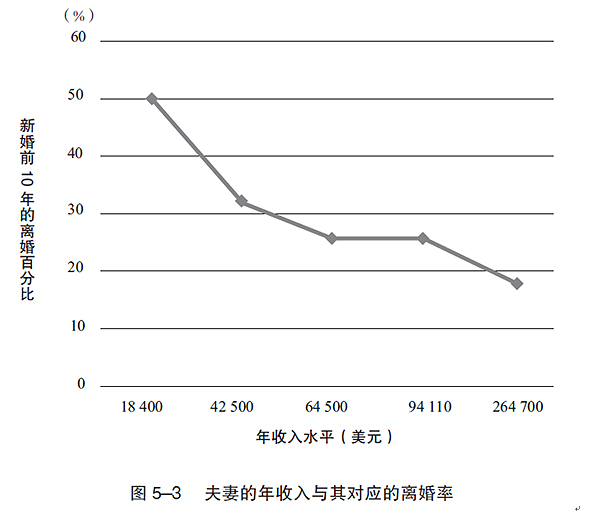 從有關財富和戀愛穩(wěn)定性的研究中我們可以清楚地看出,經(jīng)濟困境對于一段感情的正常運轉(zhuǎn)起著至關重要的作用。2010 年的《離婚與再婚》雜志上發(fā)表了一項對30 000 多名女性展開的縱向追蹤研究,結果表明,在新婚的前10 年間,與位于最高年收入前5% (264 700 美元)的家庭相比,年收入位于最后5% 的家庭(18 400 美元)的離婚率要高出2.8 倍。貧困線(23 500 美元)位于收入最低的五分位數(shù)與下一個五分位數(shù)的交界點,一旦越過這個點,離婚率便出現(xiàn)了17% 的驟減,這也是離婚率下跌的最大幅度。當收入超過中等收入水平(64 500 美元)后,離婚率也隨之出現(xiàn)了輕微的下降,但幅度卻比收入越過貧困線后出現(xiàn)的大幅驟降要小許多。