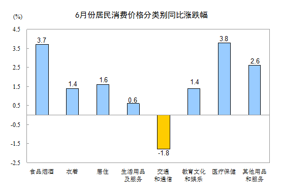6月份,其他七大類價格同比六漲一降。其中,醫(yī)療保健、其他用品和服務、居住、衣著、教育文化和娛樂、生活用品及服務價格分別上漲3.8%、2.6%、1.6%、1.4%、1.4%、0.6%;交通和通信價格下降1.8%。