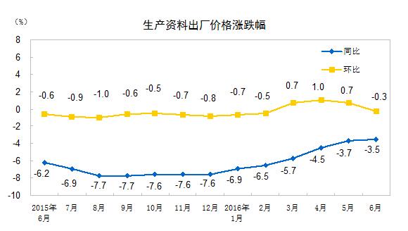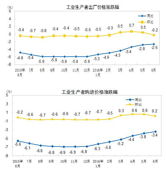 2016年6月份,全國工業(yè)生產(chǎn)者出廠價格環(huán)比下降0.2%,同比下降2.6%。工業(yè)生產(chǎn)者購進(jìn)價格環(huán)比上漲0.2%,同比下降3.4%。上半年,工業(yè)生產(chǎn)者出廠價格同比下降3.9%,工業(yè)生產(chǎn)者購進(jìn)價格同比下降4.8%。