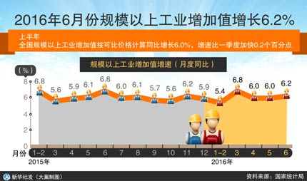 受穩(wěn)增長政策、企業(yè)效益改善等因素影響,今年以來工業(yè)生產改變了過去增速持續(xù)放緩態(tài)勢,出現一定企穩(wěn)跡象。國家統(tǒng)計局數據顯示,上半年,全國規(guī)模以上工業(yè)增加值同比增長6%,增速與上年基本持平。從近四個季度增長情況看,2015年三、四季度工業(yè)生產增速均為5.9%,今年一、二季度分別增長5.8%和6.1%,連續(xù)四個季度保持在6%左右的區(qū)間內小幅波動,終止了工業(yè)增速連續(xù)下滑的趨勢。
