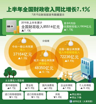 財(cái)政部數(shù)據(jù)顯示,1至6月累計(jì),全國(guó)一般公共預(yù)算收入85514億元,同比增長(zhǎng)7.1%。其中,中央一般公共預(yù)算收入37164億元,同比增長(zhǎng)3.3%;地方一般公共預(yù)算本級(jí)收入48350億元,同比增長(zhǎng)10.1%。全國(guó)一般公共預(yù)算收入中的稅收收入72236億元,同比增長(zhǎng)8.6%。