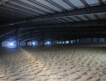 該糧庫主任張躍武說,這個糧倉的容量是3萬噸,裝糧高度是7米。2015-2016年度連珠山糧庫共收購政策性糧食19.5萬噸,目前所有糧倉都已“溝滿壕平”,收儲工作難度前所未有?!艾F(xiàn)在糧食只進不出,沒有流通,連建倉的地方都沒有了,如果不建倉,今年一斤新糧也收不上來。”