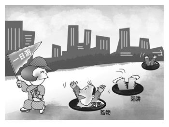 在網(wǎng)絡論壇上,近幾年都有游客發(fā)帖反映一模一樣的“北京一日游”被騙經(jīng)歷。此外,旅游網(wǎng)站、公交假站牌、酒店肆意攬客,游覽路線名不副實,強制消費、加收費用甚至甩客不顧的現(xiàn)象也屢見報端。
