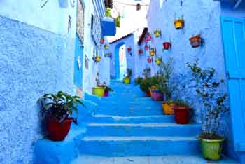 行走于舍夫沙萬(wàn),驚訝于這世間竟會(huì)有這樣的地方,將一種色彩演繹得如此淋漓盡致。屋頂、墻壁、樓梯、窗臺(tái)、甚至花盆,我目光能及的每個(gè)角落都被當(dāng)?shù)厝怂⒊闪怂{(lán)色。