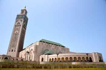 而在卡薩布蘭卡,有一座清真寺舉世聞名,那就是全世界現(xiàn)代化程度最高以及世界第三大的清真寺哈桑二世清真寺。遠(yuǎn)遠(yuǎn)看去,它似乎像一座漂浮在海上的清真寺,因?yàn)槠渲杏腥种坏拿娣e建在海上,以此來(lái)紀(jì)念摩洛哥的阿拉伯人祖先來(lái)自海上。而這個(gè)位置,也算得上伊斯蘭世界的最西端。