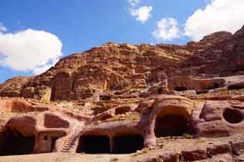第二天早上9點(diǎn),在花了將近500人民幣的門票代價(jià)后,我們順利進(jìn)入佩特拉古城。果然,剛剛進(jìn)入就是一片片略帶有粉紅色的巖石山脈,石頭上星星散散刻著一些圖案。這條峽谷兩旁巖壁上出現(xiàn)很多空洞,據(jù)說是鑿巖而成的墓碑群。這些墓碑群根據(jù)所有者身份的不同而規(guī)格不一,雕刻的圖案也各不相同。在這里,那時(shí)的人們同樣相信復(fù)活,會(huì)在生前為自己建造死后的歸屬。