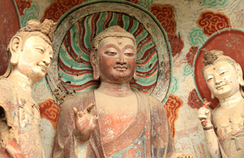 由于麥積山石質(zhì)皆為紫褐色的水成子母巖,不宜精雕細(xì)鏤,所以大多采用泥塑和繪畫,尤以泥塑藝術(shù)見長(zhǎng),被譽(yù)為“東方雕塑藝術(shù)館”。麥積山塑像,主要題材有佛、菩薩、弟子、天王、力士等,盡管歷代塑像同處一堂,但并不因襲模仿,而是保持著各自的時(shí)代特色,系統(tǒng)地反映了我國(guó)泥塑藝術(shù)的發(fā)展和演變過程。