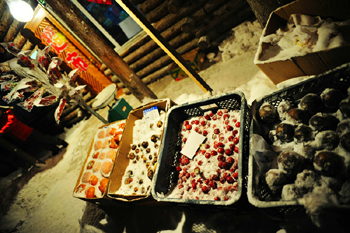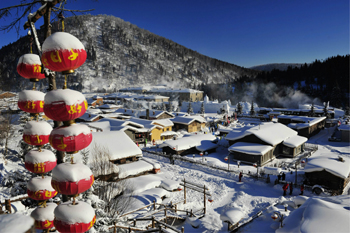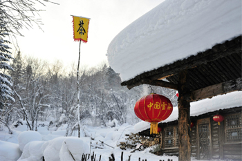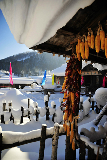 雪鄉(xiāng)的雪美得奇特,美得讓人不敢相信,真像童話故事和畫片中所描述的那樣,厚厚的白雪覆蓋的小村子連綿起伏,涌起像蘑菇一樣的座座小房子,在房頂和拌子垛上卷起一層層雪檐,她們就像剛長出來的一株株矮矮胖胖的“雪蘑菇”,慵懶而立。老房子外面的小院都是用木柵欄圍起來的,線條簡潔而不規(guī)范,如同炭筆畫漫不經心的勾勒。當柵欄的木枝披上銀色外衣之后,則酷似一根根即將融化的奶油冰棍,與中間的“蛋糕”相映成趣。房頂、大地、山上隆起的雪堆和線條柔潤如棉絮,潔白像陶塑銀雕,在陽光映照下變幻萬千,韻味無窮。家家戶戶貼滿五顏六色的掛線春聯(lián),掛起串串紅燈,把那素雅的銀裝世界裝點映襯得更加美麗生動。