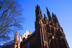 圣安娜教堂是維爾紐斯眾多教堂中有代表性的一個(gè),也是立陶宛最著名的哥特式建筑。這座小巧的教堂高只有22米,寬也只有10米,但砌教堂外墻卻用了33種不同形狀的紅磚。教堂結(jié)構(gòu)也頗為復(fù)雜,頂端既有主塔,又有若干個(gè)小捧護(hù),如眾星捧月。遠(yuǎn)望去,圣安娜教堂就像是一個(gè)由線條和角塔構(gòu)成的美麗童話。相傳,拿破侖東征沙俄時(shí)路過(guò)此地,被圣安娜教堂的精美所吸引,曾想將它“放在手掌中帶回巴黎”。