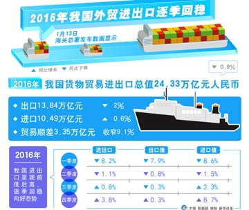 據(jù)海關(guān)統(tǒng)計(jì),2016年,我國(guó)貨物進(jìn)出口總值24.33萬億元人民幣,比2015年下降0.9%。其中,出口13.84萬億元,下降2%;進(jìn)口10.49萬億元,增長(zhǎng)0.6%;貿(mào)易順差3.35萬億元,收窄9.1%。