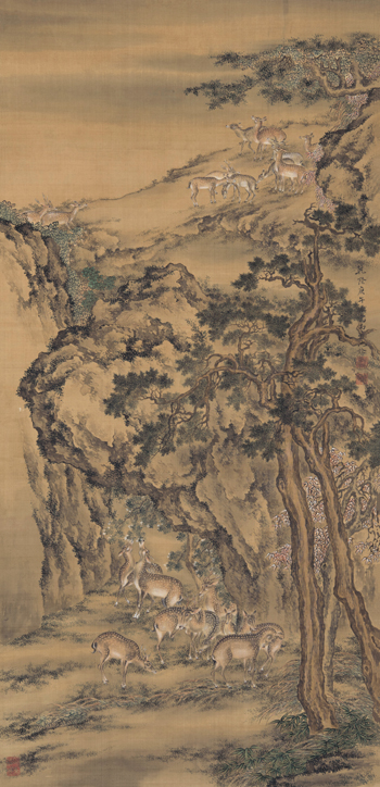 本季古代書(shū)畫(huà)依然佳作紛呈,清代著名畫(huà)家沈銓的《百鹿圖》無(wú)疑是其中翹楚。乾隆十五年(1750年),已步入晚年的沈銓寄居于蘇州,他的繪畫(huà)技藝更加純熟。就在這一年的春天,他創(chuàng)作了此幅《百鹿圖》。畫(huà)中以柏樹(shù)作襯,群鹿為主體。古柏蒼勁,喬柯蔥郁。鹿的形態(tài)刻畫(huà)逼真,渲染精細(xì)入微。柏樹(shù)刻畫(huà)渾厚大氣,柏葉工整輔以花青作襯,運(yùn)筆時(shí)又以勾勒皴擦并用來(lái)表現(xiàn)樹(shù)干的蒼秀挺拔。整圖構(gòu)圖豐滿,筆力張弛有度,敷色典雅,極具功力。