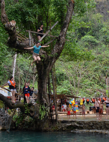湖邊有一根大樹,人們在伸向水面的樹枝上系上繩索,游客就可以利用這繩索蕩向湖水。還有人會直接站在枝丫上,來個跳水動作,落入水中。一般游客的落水只能博得各路美女哈哈大笑,而本地有的小男孩則個個是“跳水王子”,每個動作都輕盈美妙。