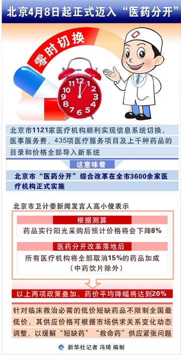 4月8日起,北京市實(shí)施了以取消藥品加成、設(shè)立醫(yī)事服務(wù)費(fèi)、調(diào)整醫(yī)療服務(wù)價(jià)格等為主要內(nèi)容的醫(yī)改措施。
