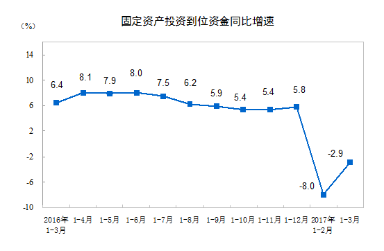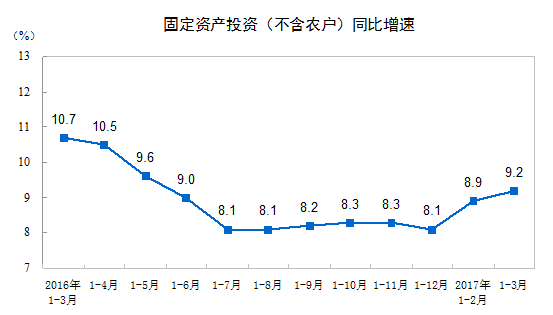 2017年1-3月份,全國固定資產(chǎn)投資(不含農(nóng)戶)93777億元,同比名義增長9.2%,增速比1-2月份提高0.3個百分點。從環(huán)比速度看,3月份固定資產(chǎn)投資(不含農(nóng)戶)增長0.87%。
