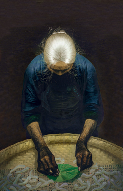 不同于《父親》通過(guò)對(duì)人物五官、神態(tài)細(xì)致入微地描繪,來(lái)達(dá)到震撼人心的效果,《春蠶》將母親的銀發(fā)作為重點(diǎn)的超寫實(shí)部分,光源自上而下透射,一絲一縷的銀發(fā)閃閃其灼,質(zhì)感蓬散卻不輕浮,厚重卻不呆板,在光線的烘托下明暗有致,栩栩如生。藝術(shù)家淡化了人物面部的處理,從側(cè)面反映出母親含辛茹苦的人生歷程:低眉垂眼間,皺紋布滿額頭,衣衫襤褸下露出一雙黢黑、蒼老的手。從上至下縱觀整件作品,由深及淺,由黑到藍(lán)灰,漸變至簸箕中的蠶的純白,畫面單純洗練,過(guò)渡行云流水。藝術(shù)家在作品中還運(yùn)用對(duì)比來(lái)彰顯感情的張力:飽經(jīng)風(fēng)霜的手邊,是象征新生與希望的桑葉,是充滿生命力的春蠶;瘦削的、骨節(jié)分明的手與豐滿的春蠶也具有強(qiáng)烈的沖擊力,這些苦心經(jīng)營(yíng)的構(gòu)圖布局與安排,使觀者不得不為之動(dòng)容。