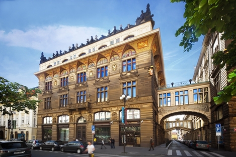 布拉格,護城河大街22號,一幢建于1896年的建筑看上去古老又滄桑,由于年代久遠,這幢新文藝復興主義風格的大樓,外立面已微微發(fā)黑。引人注目的是,在兩面墻的交接處,一只戴著金色王冠的白色獅子傲然挺立,兩條尾巴交叉揚起。