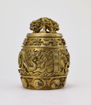 此外,此次還有一件清乾隆銅鎏金交龍鈕“夷則”編鐘上拍,款識(shí)為“乾隆八年制”五字單行楷書款。編鐘是中國(guó)古老的禮器、樂(lè)器,一套十六枚,每個(gè)的外形和大小相同,以厚薄調(diào)節(jié)音高,鐘體越薄發(fā)音越低。它的音色以黃鐘為準(zhǔn),分別是黃鐘,大呂,太簇,夾鐘,姑洗,仲呂,蕤賓,林鐘,夷則,南呂,無(wú)射,應(yīng)鐘等十二音律。圓體,中空,腰部稍大,小口齊平,頂飾交龍鈕。鐘體滿鏨紋飾,主體中層飾雙龍戲珠紋輔云紋,正中長(zhǎng)方形框中鑄陽(yáng)文楷書律名“夷則”,背面刻“乾隆八年制款”。