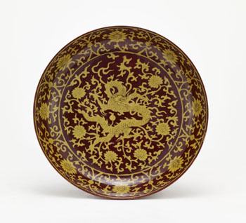 另一件拍品為明嘉靖紅地黃彩龍穿花紋盤,款識(shí)為“大明嘉靖年制”六字雙行楷書款。嘉靖彩瓷冠絕一時(shí),其彩畫之詭奇,繪事之偉麗,稱勝于明、清兩代,后世無(wú)人可及。其間發(fā)明甚多,諸種色釉相互交融,鋪陳出一個(gè)斑斕絢麗的彩瓷世界,其中紅地黃彩者最為名貴,“黃”為帝王用色,“紅”則表意幸運(yùn),兩種色彩相輔相成,表示“皇上洪?!敝樵⒁猓瑸榧尉敢怀?dú)有,深得藏家所推崇。內(nèi)外滿施礬紅彩為地,以黃彩繪龍穿花紋為飾?;椃笨d豐富,筆意瀟灑恣肆,龍紋古拙可愛(ài),雖無(wú)永樂(lè)、宣德盛世威武剛猛之氣,卻獨(dú)具詼詭古趣,為嘉靖、萬(wàn)歷時(shí)期特有之風(fēng)格。目前所見(jiàn)如本品紅地黃彩裝飾風(fēng)格的器皿主要都是云龍紋罐,穿花龍紋盤目前還僅此一例。本品所飾之紅彩色澤鮮妍,華麗凝重,雖然歷經(jīng)四百余年的風(fēng)霜,絲毫不減其風(fēng)韻,依然驚艷四方,動(dòng)人心魄。