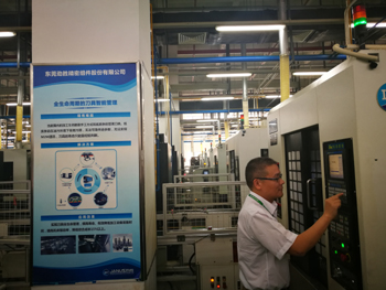 “每條線都有一個變速機(jī)看板,看板上會顯示這條生產(chǎn)線最新的狀態(tài),包括CNC的開工情況。就像這條生產(chǎn)線的22臺機(jī)器狀態(tài)中,有19臺處在加工狀態(tài),3臺處在離線狀態(tài)。這條生產(chǎn)線結(jié)果達(dá)成率為88.5%,那這個白班的加工率為85.06%,夜班的加工率43.46%,已完成加工產(chǎn)品482件,這些都能直觀地顯示出來。”勁勝相關(guān)工作人員介紹,“員工也可以拿著iPad,掃描CNC機(jī)上的二維碼,iPad上就顯示這是哪臺機(jī)床,正在加工的是哪種產(chǎn)品,用的是哪些輔助材料,哪一把刀。”