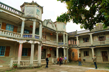 走在東大村的斑駁古樸小道上,古厝房頂上成片的紅瓦在藍天映襯下,耀眼而獨特。誰能想到,這么偏僻的小山村里竟藏有數(shù)量如此之多,規(guī)模如此之大的老洋房呢?令人驚嘆!在龍眼密林掩映中,一座雙層的堞樓“把守”在前往洋房大厝集中區(qū)的路口。堞樓在古代俗稱炮樓,因舊時匪患時起,早年下南洋的東源村村民姚文瑞,回國后募捐建造了這座堞樓用于自衛(wèi)。正是因為這座不起眼的鋼混結(jié)構(gòu)堞樓,全村華僑的房產(chǎn)才能夠半世紀安然無恙。在堞樓的一層保存著完好的射擊孔,沿著狹小的樓梯上到二樓,四個角落設計有鋼混結(jié)構(gòu)的木窗,還有數(shù)個正方形槍眼,如果置身樓頂極目遠眺,時光頓時倒回到當年東大、東源村人與匪患抗爭的烽火歲月。