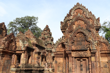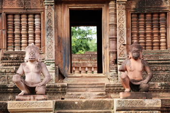 離開吳哥窟,驅(qū)車向北約40分鐘左右就到了女王宮。雖然俗稱女王宮,其實這也是一座寺廟,但是與其他寺廟不同,它是由砂巖建造而成,通體呈朱紅色。這里的建筑比其他寺廟低矮許多,從門框、門楣,到挑檐、基座都無比華麗,精致繁復(fù)的浮雕無處不在,用作家蔣勛的話來講:“幾乎是以紡織刺繡的工法在做石雕,令人嘆為觀止。”