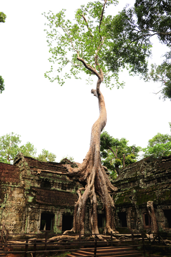 巴戎寺往東不遠就是塔布隆寺,這座因好萊塢電影《古墓麗影》而名聲大噪的寺廟幾乎被叢林吞噬。廢棄數(shù)百年間,古樹早將神廟緊緊纏繞,樹的根莖穿繞在梁柱、屋檐、門窗之間,探入石縫,和廟宇融為一體,它們相互依靠,卻又彼此對抗。