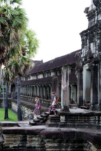 看過日出從西門進入游覽,吳哥寺外圍回廊上的浮雕長達百米,人物眾多、雕刻生動,像徐徐展開的畫卷講述古老的史詩;寺廟里面殿堂互通,隨處可見肢體殘缺的佛像,有的整面墻都刻著神秘古老的文字,上午的日光透過石柱斜撒在雕刻上,那種顆粒感透著歷史的滄桑。仙女浮雕是寺里最常見的形象之一,她們頭飾華麗,形態(tài)各異,或端莊而立,或翩翩起舞。這些稱為阿普薩拉的仙女體態(tài)婀娜,笑不露齒,據(jù)說在吳哥寺上千個仙女像中,只有一個例外,如果有興趣,不妨細細找一找這位露齒微笑的仙女。