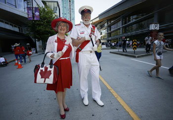 ??? 7月1日是加拿大國(guó)慶日,溫哥華當(dāng)日舉辦活動(dòng),慶祝加拿大建國(guó)150周年?!D為一對(duì)老夫婦精心打扮參加國(guó)慶日活動(dòng)。新華社發(fā)(梁森 攝) |