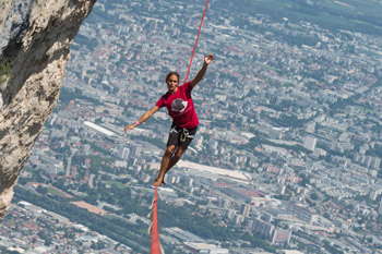 ??? 7月7日,在法國(guó)東部朗桑韋科爾的山峰間,一名男子在高空中走扁帶。扁帶運(yùn)動(dòng)是一項(xiàng)在懸空扁帶上行走并保持身體平衡完成各種技巧動(dòng)作的新運(yùn)動(dòng)。其中高空扁帶是在高山、峽谷之間架起扁帶,采用自保護(hù)形式行走,不借助任何平衡工具的輔助,是扁帶運(yùn)動(dòng)中最為驚險(xiǎn)刺激的一個(gè)項(xiàng)目,被譽(yù)為“天空芭蕾”。新華社/法新 |