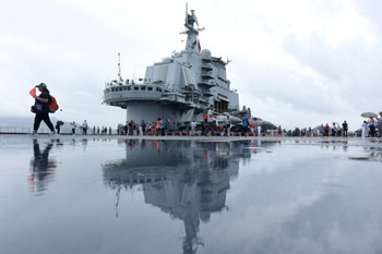 ??? 7月8日,香港市民在遼寧艦的飛行甲板上參觀。當(dāng)日,中國(guó)首艘航空母艦遼寧艦在香港開(kāi)始向公眾開(kāi)放。記者 秦晴 攝 |