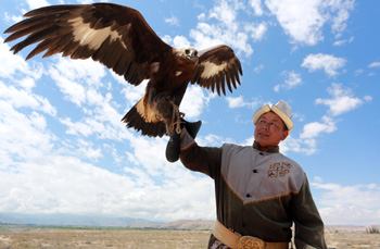??? 7月15日,在吉爾吉斯斯坦伊塞克湖附近的通村,一名養(yǎng)鷹人放飛獵鷹。當日,吉爾吉斯斯坦傳統(tǒng)的“民族節(jié)”慶祝活動在這里舉行。新華社/歐新 |