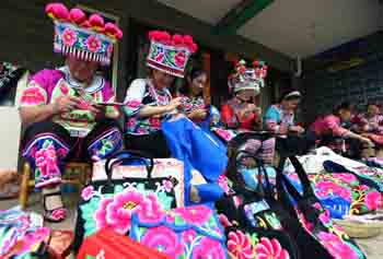 ??? 7月16日,彝族繡娘在云南省楚雄市彝人古鎮(zhèn)繡制服飾。當日,60多名彝族民間繡娘匯集到彝人古鎮(zhèn),參與“指尖上的技藝”彝族刺繡動態(tài)展示活動。記者 楊宗友 攝 |