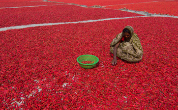 ??? 7月13日,在孟加拉國北部博格拉,當?shù)剞r(nóng)民晾曬收獲的紅辣椒。新華社/西霸 |