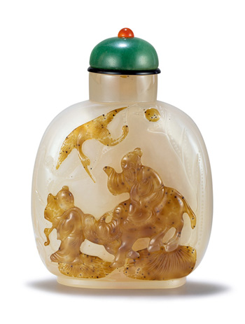 今年春拍期間,華辰拍賣也特別推出了《荷香書屋藏鼻煙壺》專場(chǎng),其中大部分拍品曾在蘇州博物館展出,并著錄于著名收藏家張宗憲先生藏鼻煙壺展覽圖錄《金玉滿堂·掌中寶——香港張宗憲先生藏鼻煙壺特展》。其中不乏精彩的料器煙壺。如清代雞油黃地鼻煙壺,以雞油黃及棕黑色兩色彩料制成,紋樣如水墨波紋暈散開來(lái),亦似層巒疊嶂,江山如畫,紋飾獨(dú)到。側(cè)面刻“玩雅軒”三字刻款。有學(xué)者認(rèn)為帶有此種款識(shí)的鼻煙壺多為瘦長(zhǎng)形。