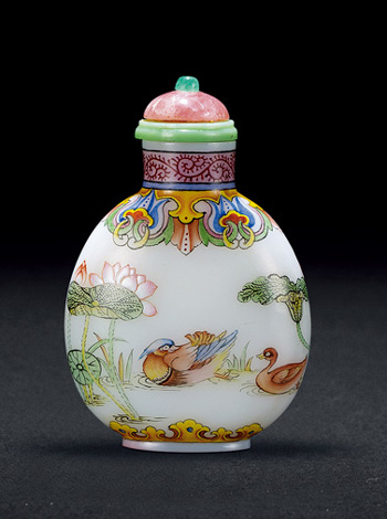 清 涅白胎畫琺瑯蓮池鴛鴦紋鼻煙壺 |