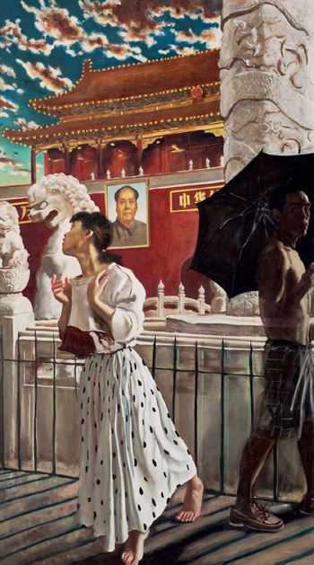 20世紀80年代至90年代早期,趙半狄從自己認同的經(jīng)典藝術史中汲取營養(yǎng),從而發(fā)展出自身獨特的技巧。這些作品構圖嚴謹、筆法克制,以敘事性的日常場景刻畫具體時空中普通人的存在與精神狀態(tài)?!逗罚?990年)、《遠方來信》(1988年)、《涂口紅的女孩》(1987年)等作品將個體經(jīng)驗與歷史元素獨特而鮮活地結合起來。1994年,在戴漢志策劃的展覽“月光號”上,趙半狄將數(shù)朵以10元人民幣疊成的“花”置于浸潤著血液的花瓶中的肋骨上,制造出甜膩誘人而殘酷可怖的消費社會景觀(《一個童話》,1994年)。1996年起,趙半狄轉而運用作為流行文化形式的廣告攝影與作為國家象征符號的可愛熊貓形象,巧妙地介入彼時方興未艾的社會狀況。他運用具有宣傳與推廣作用的“熊貓”符號與視覺形式創(chuàng)作了一系列展示公益性內(nèi)容的燈箱,嘗試與藝術界之外的廣闊公共領域對話(《趙半狄和熊貓》,1999年)。