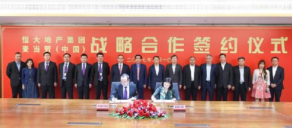 8月14日,恒大地產(chǎn)集團(tuán)與麥當(dāng)勞(中國)簽訂長期戰(zhàn)略合作協(xié)議,恒大集團(tuán)董事局主席許家印,恒大集團(tuán)董事局副主席、總裁夏海鈞,恒大集團(tuán)常務(wù)副總裁兼恒大地產(chǎn)集團(tuán)總裁時(shí)守明,中國中信集團(tuán)董事長常振明,中信集團(tuán)總經(jīng)理助理兼中信證券董事長張佑君,中信銀行行長孫德順,中信資本董事長兼麥當(dāng)勞中國董事會主席張懿宸等出席了簽約儀式。