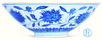 明宣德內(nèi)模印外青花纏枝蓮紋斗笠碗
