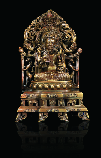 “玉器工藝品”專場(chǎng)中,以玉器開(kāi)場(chǎng),甄選牌、佩、山子、爐、屏等不同玉質(zhì),各式器型的拍品,以供選藏。其中“清乾隆白玉留皮朝冠耳獸足爐”尤為突出,玉質(zhì)瑩潤(rùn),玉色潔白,選料較大,掏膛爽利,加之獸足寥寥數(shù)刀,生動(dòng)逼真,頗為添色。佛教藝術(shù)品一類亦是本專場(chǎng)的重點(diǎn),其中不同時(shí)期的金銅造像,即有宮廷風(fēng)格,又有西藏風(fēng)格等。其中“清乾隆銅鎏金財(cái)寶天王像”為乾隆宮廷造像,鑄造生動(dòng),鏨刻清晰,實(shí)為藏奉首選。另外,“清乾隆合金銅白上樂(lè)金剛像”亦十分突出,反映了乾隆宮廷在佛造像中的慕古風(fēng)格,表現(xiàn)出清廷對(duì)于西藏所供古代風(fēng)格造像的推崇,作品遵循經(jīng)典的印度樣式,寶座及背光均頗具特色。