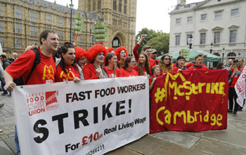 ??? 9月4日,英國(guó)部分麥當(dāng)勞員工舉行罷工,以期提升薪資水平、改善工作條件。這是麥當(dāng)勞在英國(guó)開業(yè)以來首次發(fā)生罷工事件。新華社/法新 |