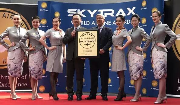 全球航空公司與機場服務(wù)權(quán)威調(diào)研機構(gòu)SKYTRAX主席Edward Plaisted向海南航空總裁孫劍鋒頒發(fā)五星航空公司獎牌