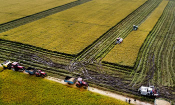 ??? 9月17日,安徽霍邱縣范橋鎮(zhèn)種糧大戶(hù)戚仁杰組織收割機(jī)收獲水稻。地處淮河南岸的霍邱縣是產(chǎn)糧大縣,今年全縣195萬(wàn)畝水稻豐收在望。種糧大戶(hù)、范橋鎮(zhèn)雙元村村民戚仁杰2010年流轉(zhuǎn)1200多畝淮河行洪區(qū)的水田,成立眾樂(lè)糧食種植專(zhuān)業(yè)合作社,進(jìn)行全機(jī)械化作業(yè),連年取得好收成,今年畝產(chǎn)達(dá)到700多公斤,總產(chǎn)糧食700多公斤,總產(chǎn)糧食80多萬(wàn)公斤。記者 陶明 攝 |