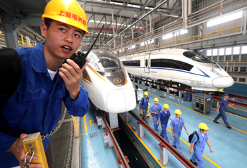 ??? 9月19日,技術(shù)保障人員進(jìn)入上海虹橋“復(fù)興號(hào)”動(dòng)車(chē)檢修庫(kù)進(jìn)行相關(guān)作業(yè)。21日起,“復(fù)興號(hào)”動(dòng)車(chē)組在京滬高鐵提速至350公里時(shí)速運(yùn)行。記者 陳飛 攝 |