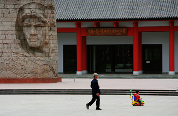 ??? 圖為紅軍強渡大渡河紀念館外,一名老人帶著孩子在經(jīng)過。(四川省旅游發(fā)展委員會供圖) |