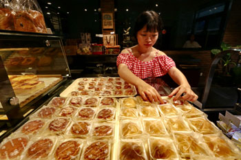 ??? 9月23日,四川省遂寧市一家糕點(diǎn)店的員工在擺放月餅。中秋佳節(jié)臨近,各地月餅飄香上市。新華社發(fā)(鐘敏 攝) |